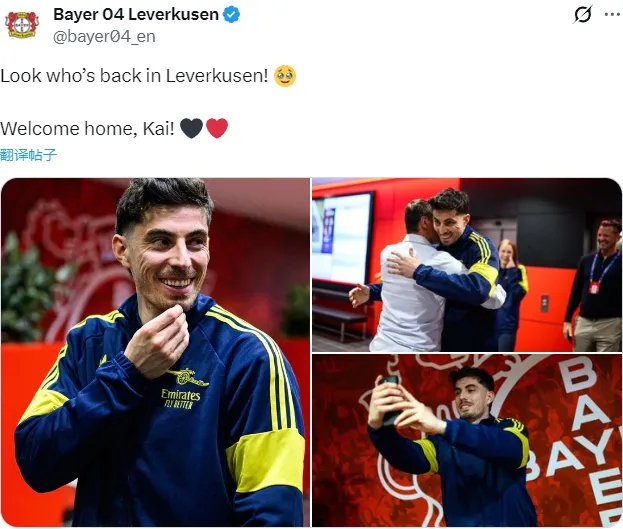 勒沃库森官推赛前欢迎哈弗茨回家,并且赛前还为哈弗茨送上了纪念品。